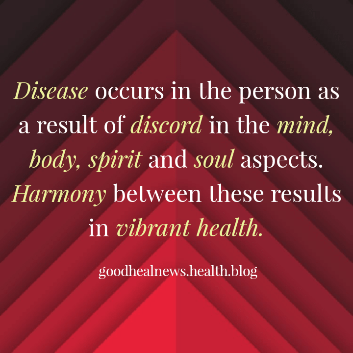 In holistic medicine health is considered as the by product of the harmony between the mind, body, spirit and soul of the person. Discord on the other hand manifests disease in all its forms.
